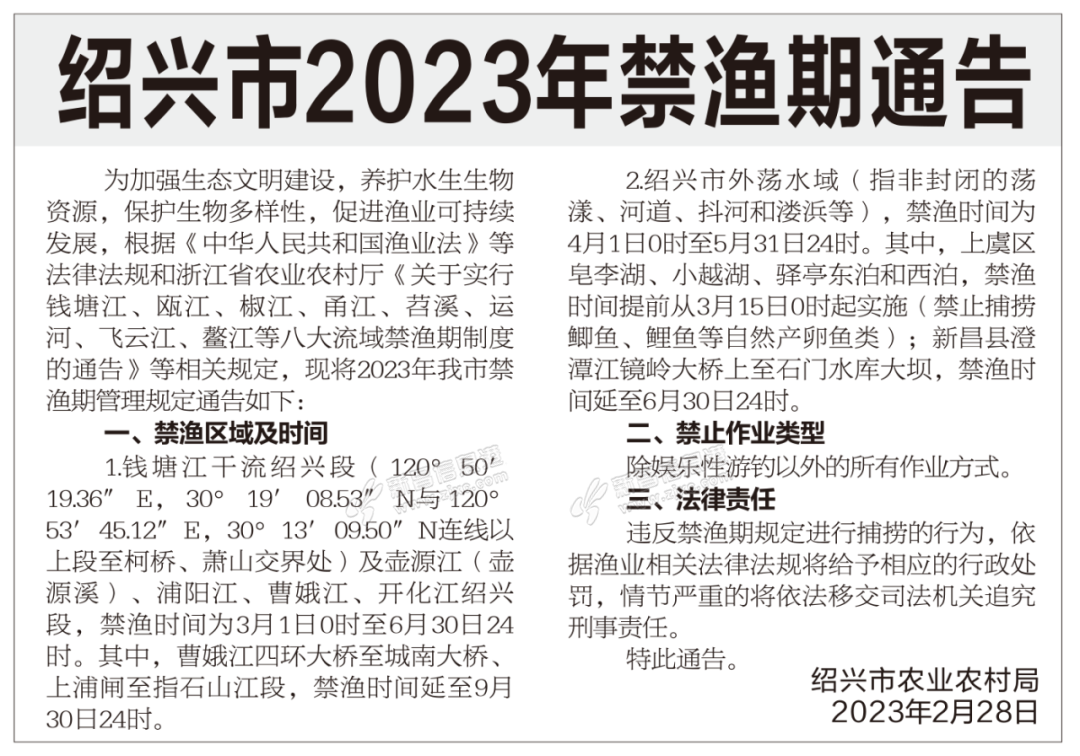 2月28日,绍兴市农业农村局发布绍兴市2023年禁渔期通告。通告内容如下:(转自绍兴发布微信公众号)