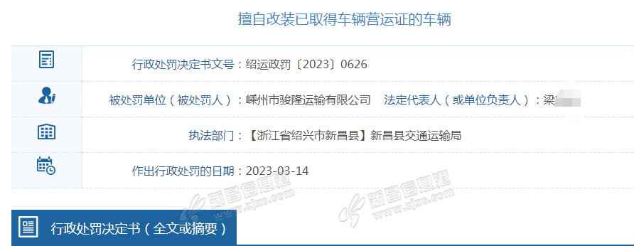 主要违法事实: 2023年3月14日15时15分,新昌县交通运输局执法人员(执法证号分别为1**********7、1**********2),在羽林隧道口巡查时,发现车辆所有人嵊州市骏隆运输有限公司的浙DK3069/浙DE526挂有违法嫌 ...