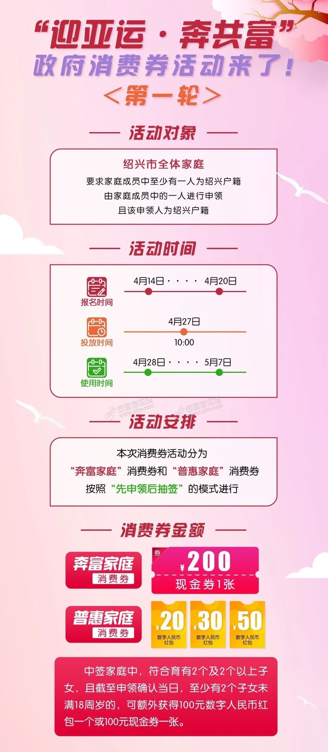 绍兴市民朋友们,“迎亚运·奔共富”政府消费券活动即将开始啦~第一轮总额6000万!普惠家庭消费券总额2000万,奔富家庭消费券总额4000万,绍兴市全体家庭都可申领! 新一轮消费券即将开启报名,届时将在浙里办AP ...