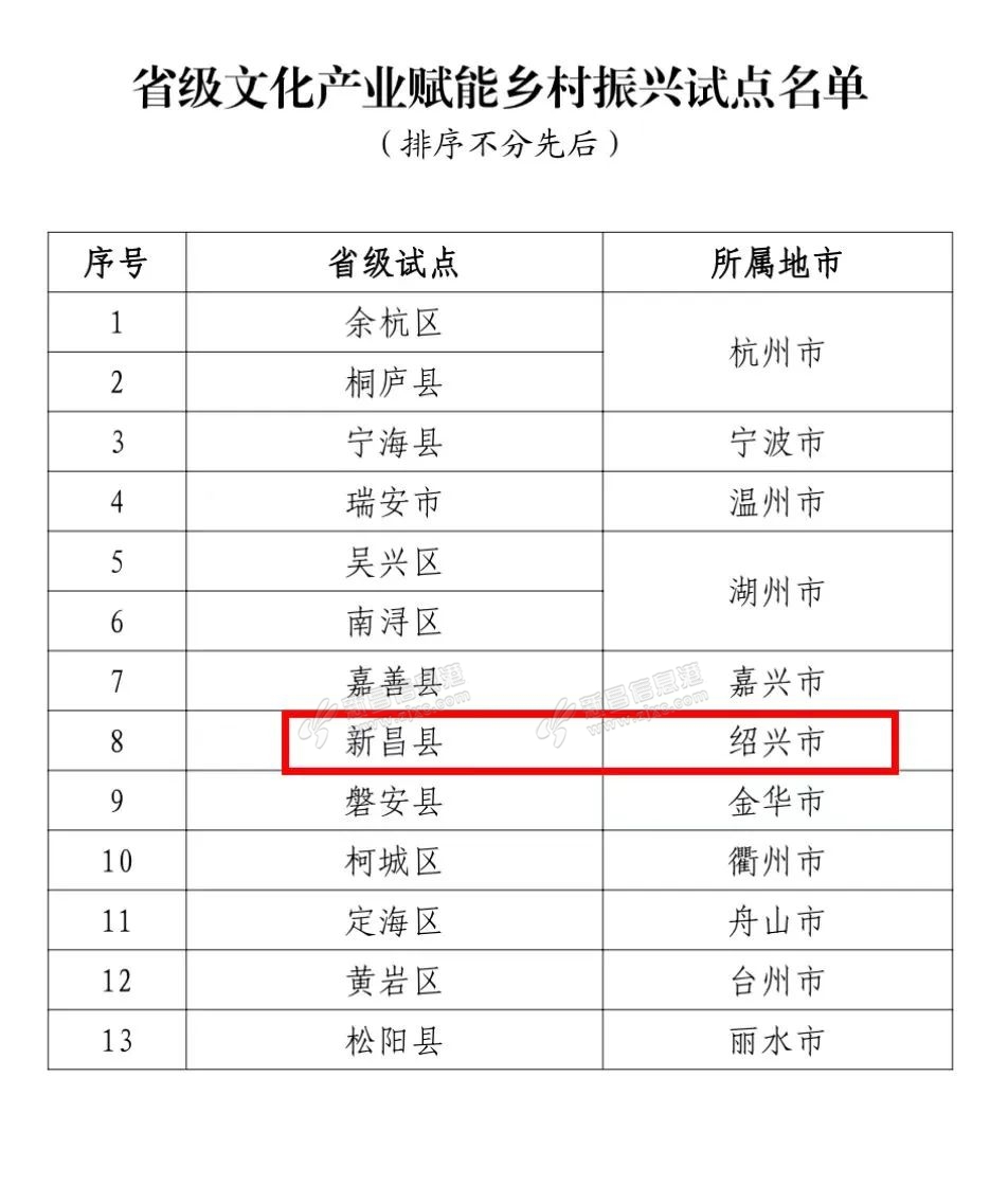 近日,浙江省文化和旅游厅、浙江省教育厅、浙江省自然资源厅、浙江省农业农村厅、浙江省乡村振兴局联合发文,公布省级文化产业赋能乡村振兴试点名单,新昌县成功入选。