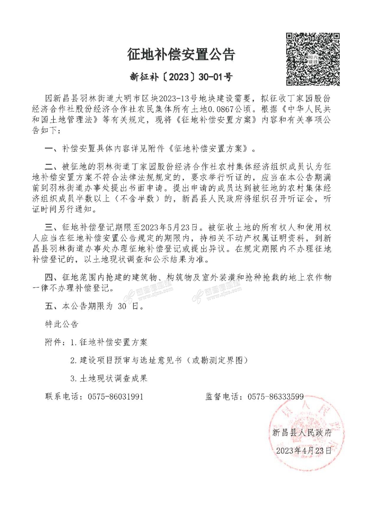 土地征收补偿安置公告(新昌县羽林街道大明市区块2023-13号地块) 来源: 新昌县自然资源和规划局 原标题:土地征收补偿安置公告