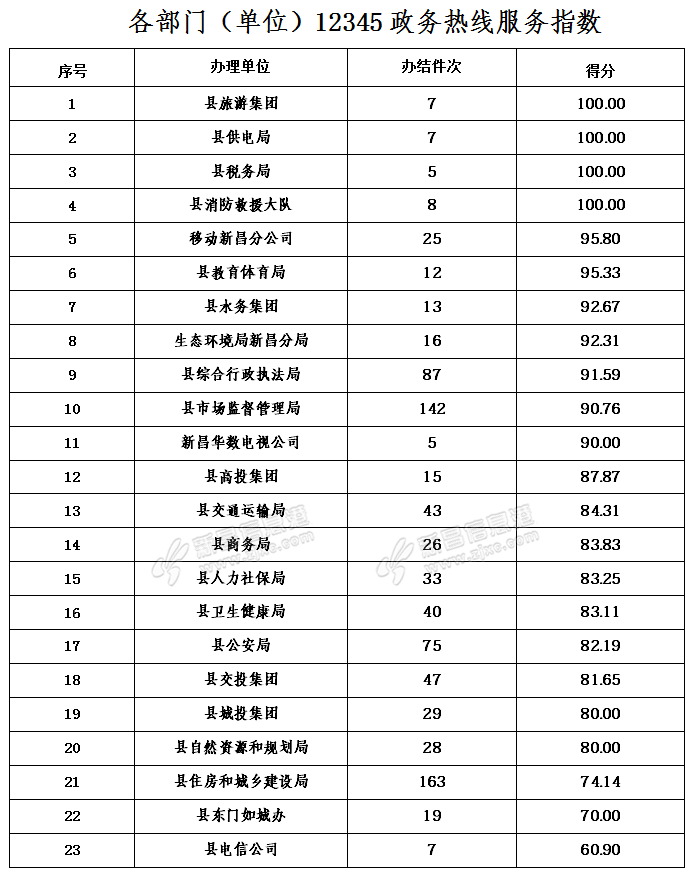 12345政务热线服务指数公布(2023年3月) 为提升“12345”政务热线事项办理质量与效率,全力助推我县“最多跑一次”改革,根据《新昌县12345政务热线服务指数媒体公开实施方案(2022年版)》的要求,现将3月12345政 ...