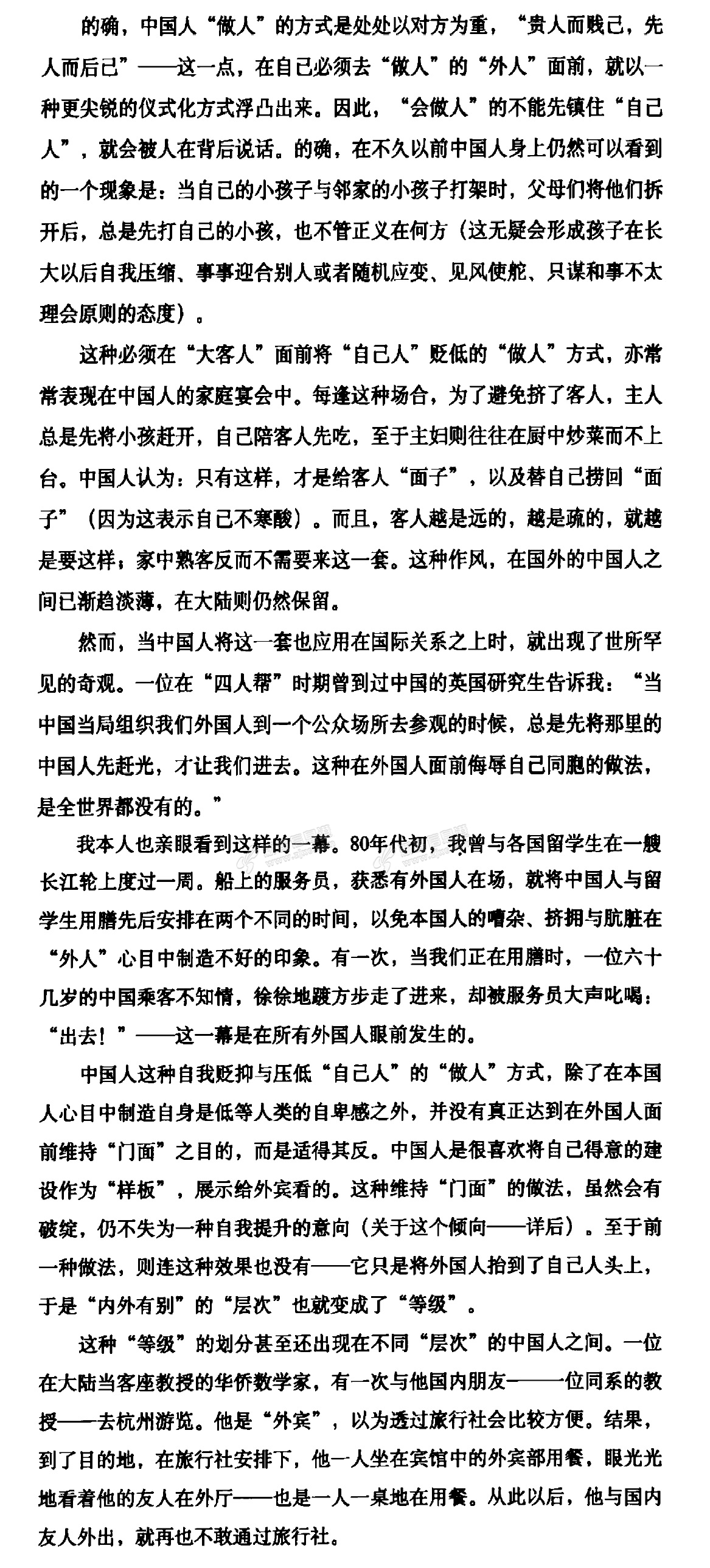 曾经在知乎上看到一个帖子,很能反映中国人为了维护关系而自残的荒唐: 贴主是一个已婚女性,她在结婚后,她那老公没什么本事,挣不了多少钱,经济压力之下,回到家中对老婆也就没有个好的态度,偏偏很在乎几个狐朋狗友,钱被狐朋狗友借去,收不回来,照样好吃好喝招待人家。现在她已经和老公离婚,并重新结婚了,结婚的对象就是借前夫钱不还的狐朋狗友,两个人一起在背后嘲笑前夫冤大头。 (有心的人不妨搜索一下这个帖子,说不定能找到) |