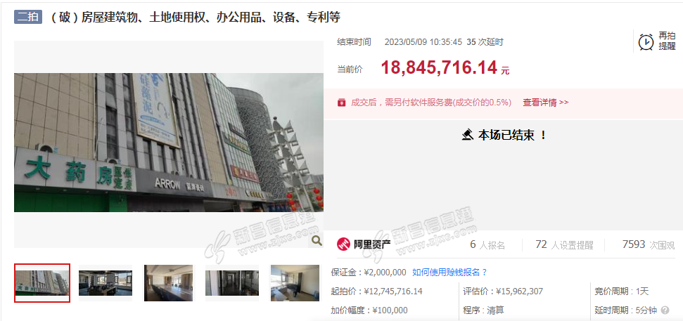 新昌别克跃电动工具有限公司破产,拍卖房屋建筑物及国有土地使用权、办公用品、机器设备、专利,经过43轮竞拍成交 来源:阿里拍卖