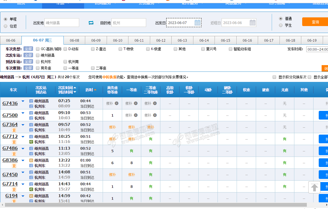 东钱湖 发表于 2023-6-6 16:12 是的,很难买早上的车次,尤其是七-八点的高铁,提前二天都不一定能买得到。本来今天要出差,昨天订票时已经没有今天早上九点到杭州的票了,所以只订到明天的票。这种情况经常出现,必须提前几天才能订到,临时订票想都不要想,除非下午或晚上的车。 |