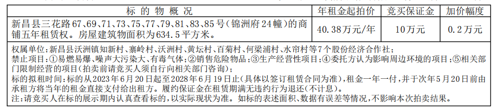 拍卖公告 受新昌县沃洲镇人民政府的委托,我公司定于2023年6月13日上午9时起至上午11时止(延时除外)在中拍平台(https://paimai.caa123.org.cn/)对以下标的进行公开拍卖,现将有关事项公告如下: ...