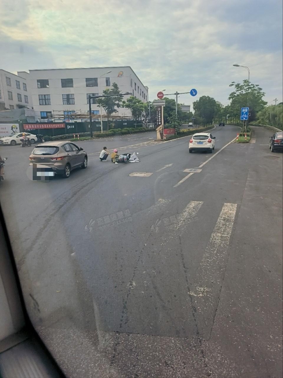 就在浙江品诺机械有限公司附近,电瓶车被一辆小型SUV撞倒,俩司机一起蹲在地上等。