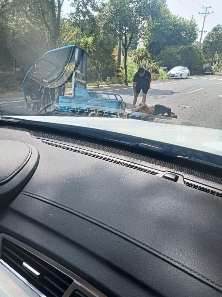 9点多大市聚不到,刚加油站过来,小轿车和三轮车相撞,一老人倒在三轮车旁的地上,救护车也来了。