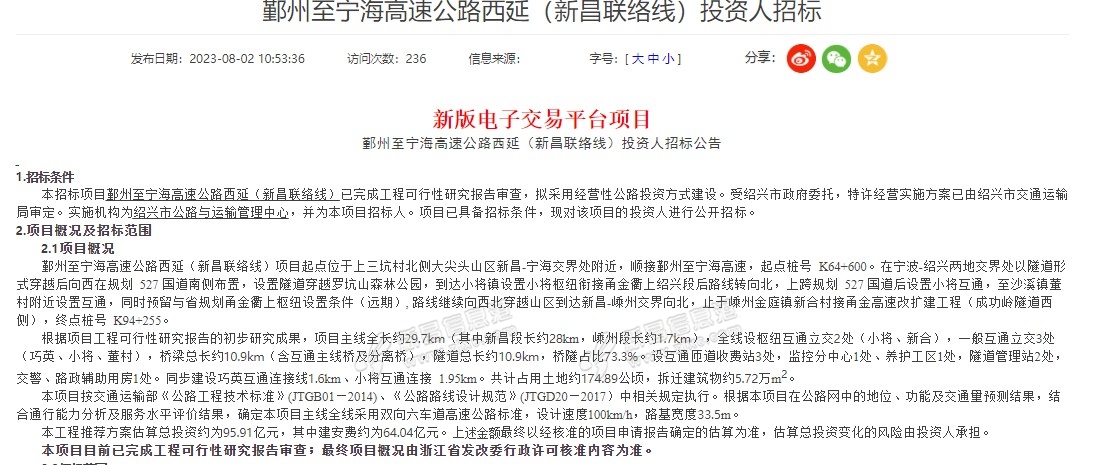 项目概况鄞州至宁海高速公路西延(新昌联络线)项目起点位于上三坑村北侧大尖头山区新昌-宁海交界处附近,顺接鄞州至宁海高速,起点桩号 K64+600。在宁波-绍兴两地交界处以隧道形式穿越后向西在规划 527 国道 ...