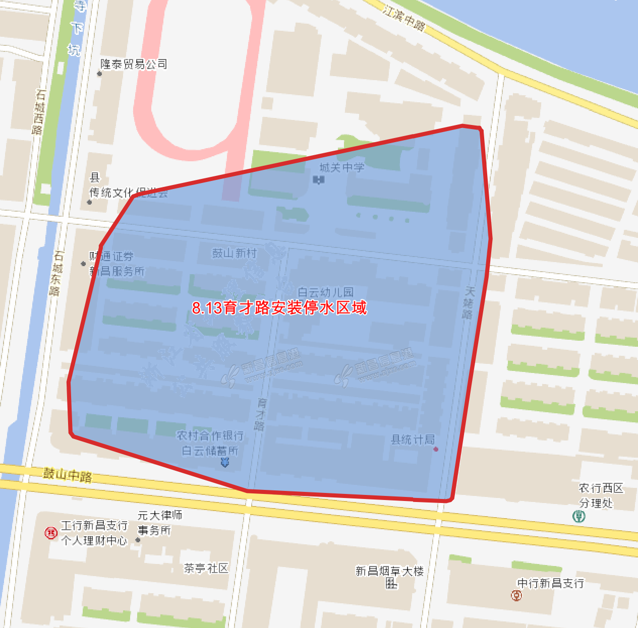 各位用户:因育才路安装施工需要,现将有关停水事项通告如下:一、停水时间8月13日8:30起至8月13日23:30(预计15小时)。二、停水范围天姥路140-168号,鼓山中路130-200号,石城东路9-27号,沃洲路50-74号,育才路等 ...