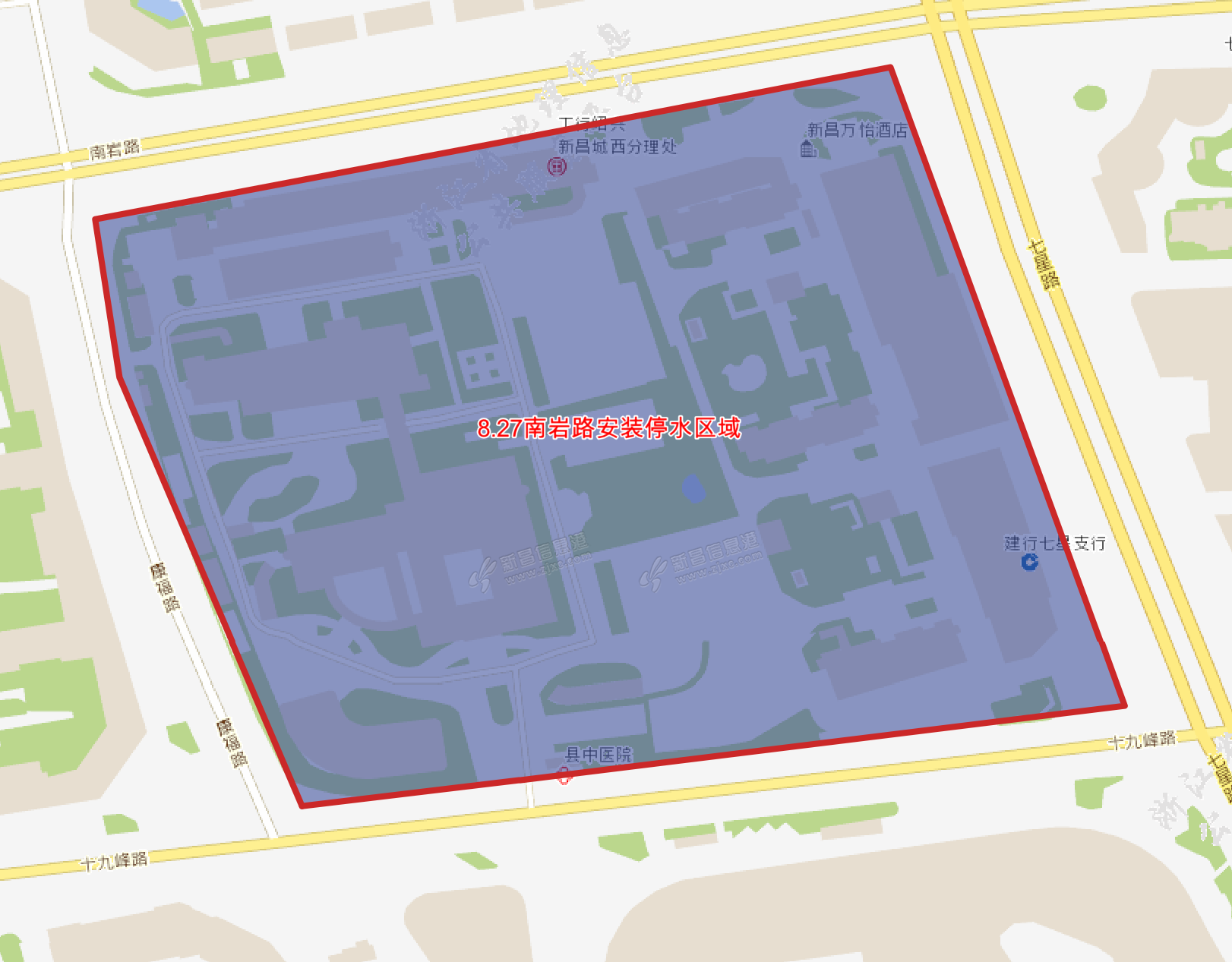 各位用户:因南岩路(康福路至七星路段)安装施工需要,现将有关停水事项通告如下:一、停水时间8月27日13:00起至8月27日17:00(预计4小时)。二、停水范围新昌县中医院、和悦广场整片住宅区及商铺、新昌万怡酒店等 ...