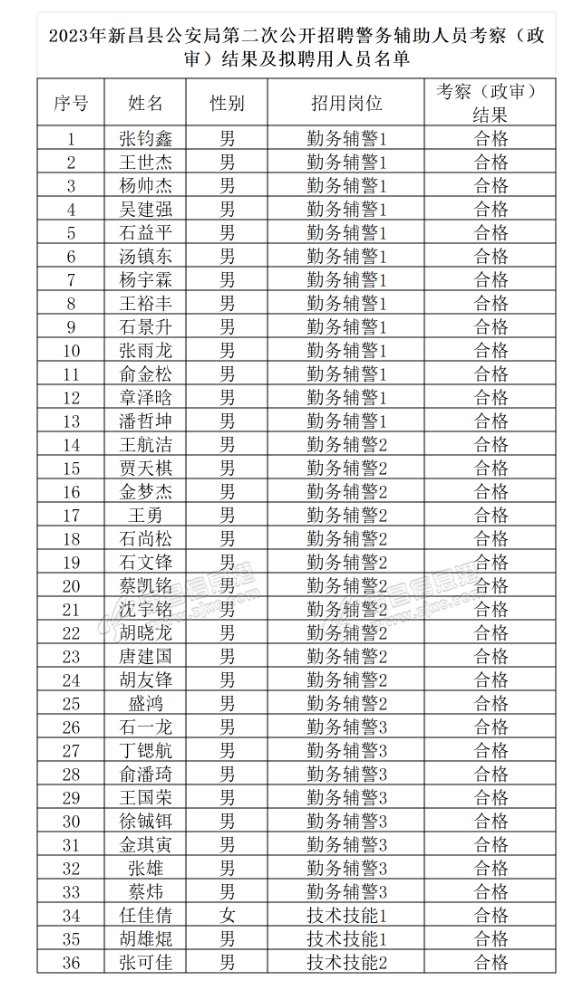 根据《2023年新昌县公安局第二次公开招聘警务辅助人员公告》,现将2023年新昌县公安局第二次公开招聘警务辅助人员政审(考察)结果及拟聘用人员予以公示。现就有关事项明确如下: 1.公示时间从2023年8 ...
