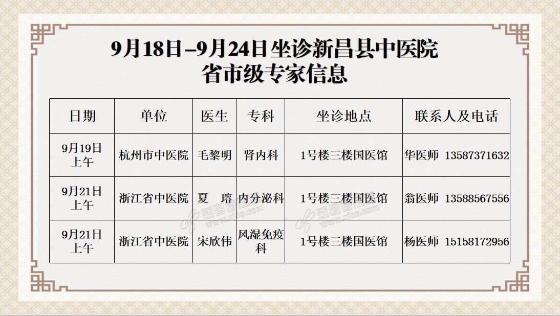 温 馨 提 示 新昌县中医院连贯医疗服务中心预约电话0575-86502366 门诊时间:上午08:00——11:30 下午13:30——17:00 急诊内、外科及发热门诊24小时开放。 来源:新昌县中医院