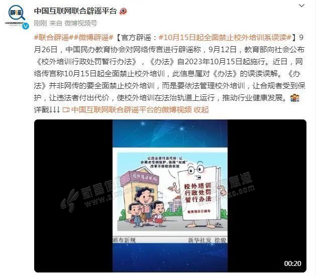日前,中国民办教育协会对网络传言进行辟谣称,9月12日,教育部向社会公布《校外培训行政处罚暂行办法》,《办法》自2023年10月15日起施行。 近日,网络传言称10月15日起全面禁止校外培训,此信息属对《办法》的误 ...