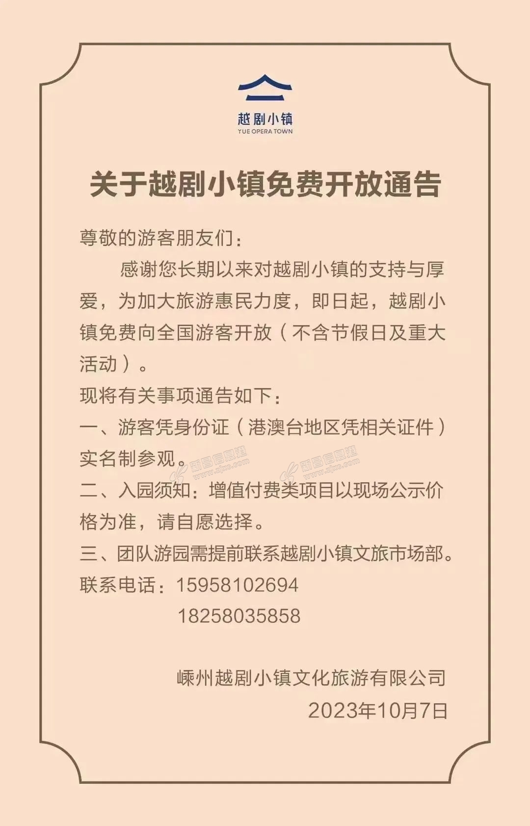 10月7日,嵊州越剧小镇文化旅游有限公司发布通告,越剧小镇除节假日及重大活动时,免费向全国游客开放。 来源:越生活综合越牛新闻