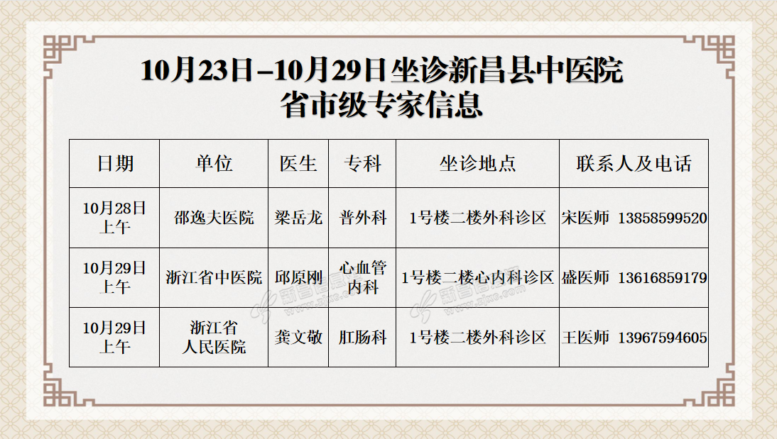 温 馨 提 示 新昌县中医院连贯医疗服务中心预约电话0575-86502366 门诊时间:上午08:00——11:30 下午13:30——17:00 急诊内、外科及发热门诊24小时开放。 来源:新昌县中医院