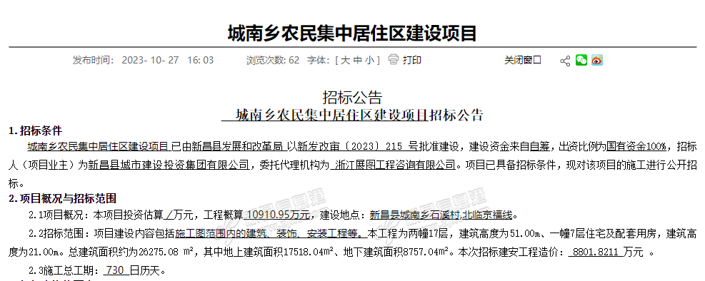 城南乡农民集中居住区建设项目招标公告1.招标条件 城南乡农民集中居住区建设项目 已由新昌县发展和改革局 以新发改审〔2023〕215 号批准建设,建设资金来自自筹,出资比例为国有资金100%,招标人(项目业主 ...
