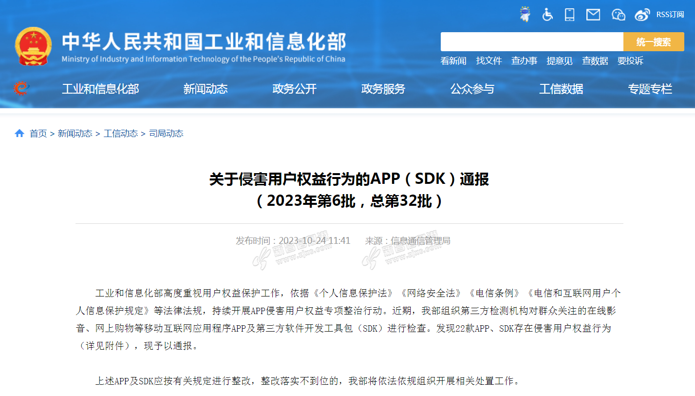 据工业和信息化部网站24日消息,近期,工业和信息化部组织第三方检测机构对群众关注的在线影音、网上购物等移动互联网应用程序APP及第三方软件开发工具包(SDK)进行检查,发现22款APP、SDK存在侵害用户权益行为,现 ...