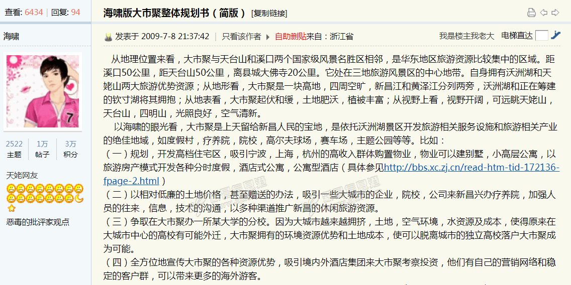 去看看太湖,看看太湖周边的发达城市,太湖的虹吸效应都没完全释放,跑小小山区一块台地,是吸引不了大的人居产业,连大市聚人自己都跑新昌跑了。 唯有工业才能促进当地就业岗位,最快使老百姓脱贫致富,所谓的疗养旅游业就放到东茗片区,风景更宜人 |