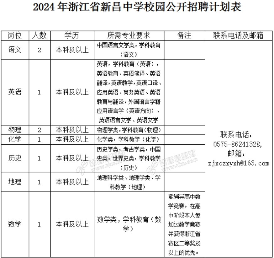 一、招聘计划 2024年浙江省新昌中学计划校园公开自主招聘学科教师9名,具体招聘岗位、人数、学历和专业要求等详见《2024年浙江省新昌中学校园公开招聘教师计划表》。 具体可登录新昌县政府门户网站(http://www.zjx ...