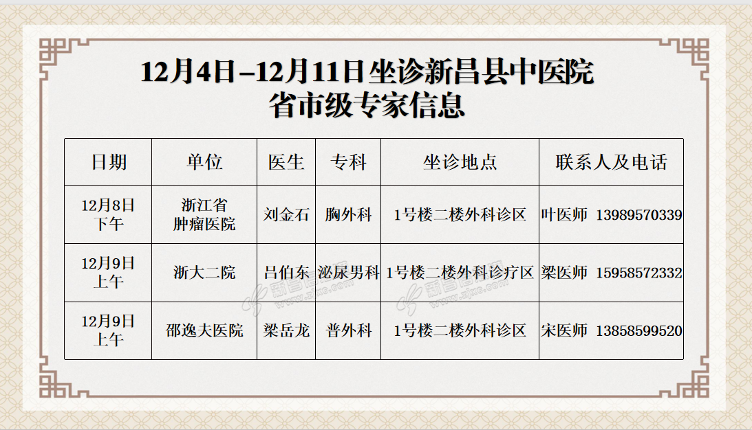 温 馨 提 示 新昌县中医院连贯医疗服务中心预约电话0575-86502366 门诊时间:上午08:00——11:30 下午13:30——17:00 急诊内、外科及发热门诊24小时开放。 来源:新昌县中医院