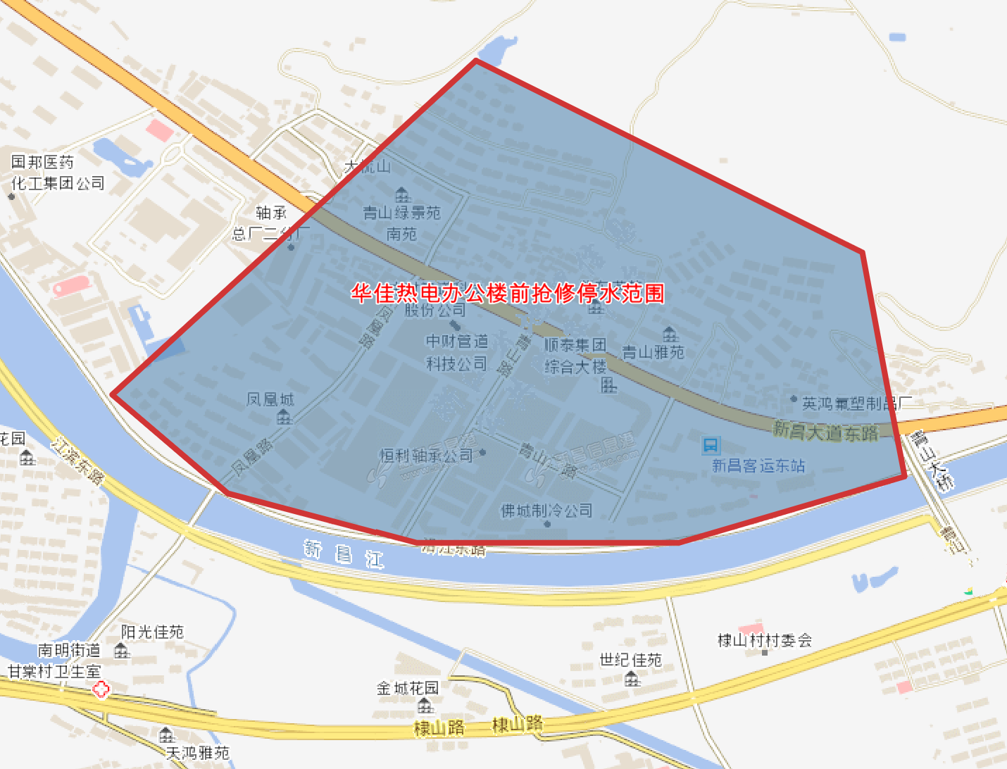 各位用户:因华佳热电办公楼门口抢修施工需要,现将有关停水事项通告如下:一、停水时间2023年12月6日19:00至12月7日3:00(预计8小时)。二、停水范围大道东路(华佳热电至青山大桥头)两侧,青山工业区、青山头村、华 ...