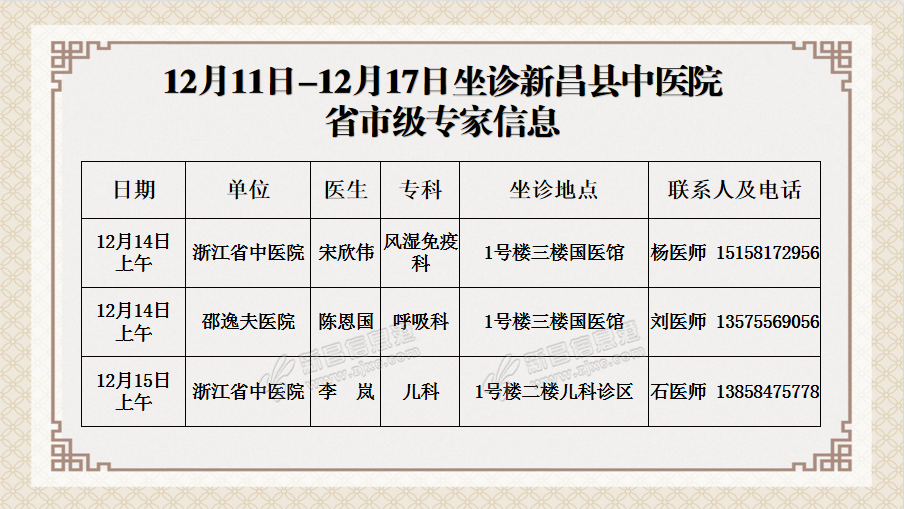 温 馨 提 示 新昌县中医院连贯医疗服务中心预约电话0575-86502366 门诊时间:上午08:00——11:30 下午13:30——17:00 急诊内、外科及发热门诊24小时开放。 来源:新昌县中医院 ...