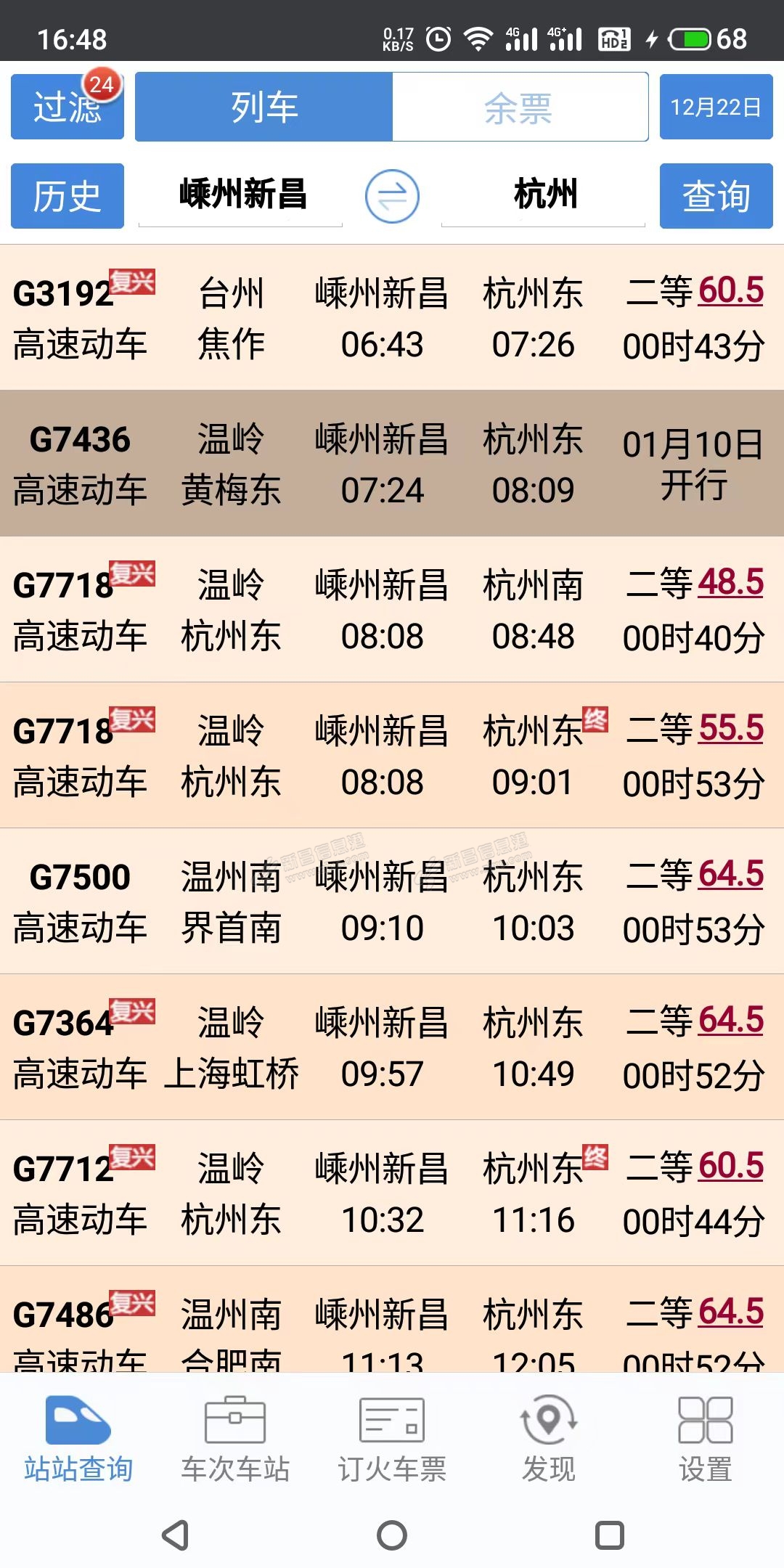 卖炸串的小胖 发表于 2023-12-21 17:03 G7436次车本来一直停靠嵊州新昌站的,七月调图后不停了,应该是早上嵊州新昌站到杭州方向的人太多,这次车又停嵊州新昌站了,也是杭台铁路上到杭州最便宜的一次车. G7436次每天挤得象地铁一样,到杭州东站后大部分乘客都下了,去杭州以远黄梅方向的不到半车人. ![]() ![]() ![]() |