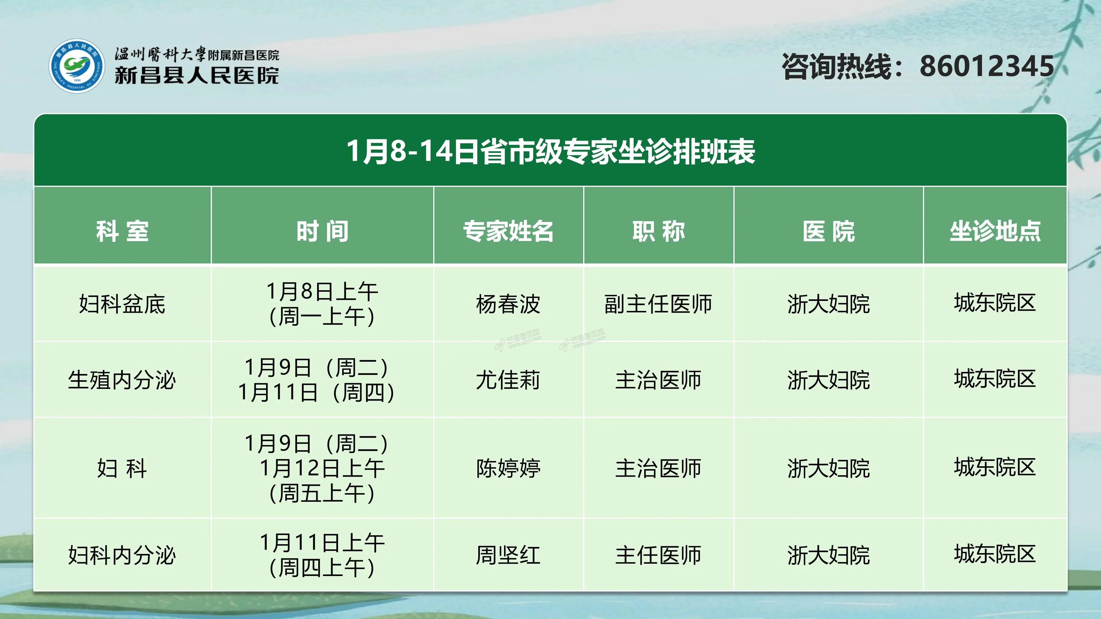 省市级专家坐诊信息 妇 科陈婷婷主治医师 预约挂号方式 电话预约:提前两天拨打0575-86012345 来源:新昌县人民医院