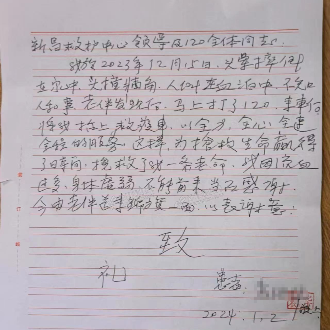 元旦刚过,县人民医院院前急救办公室迎来了一位特殊的访客,一位耄耋老人拄着拐杖,手里拿着锦旗和感谢信走进了办公室。原来是姚爷爷,医护人员一眼便认出了他,他带着老伴袁婆婆的感谢信和锦旗,特地来感谢院前急救 ...