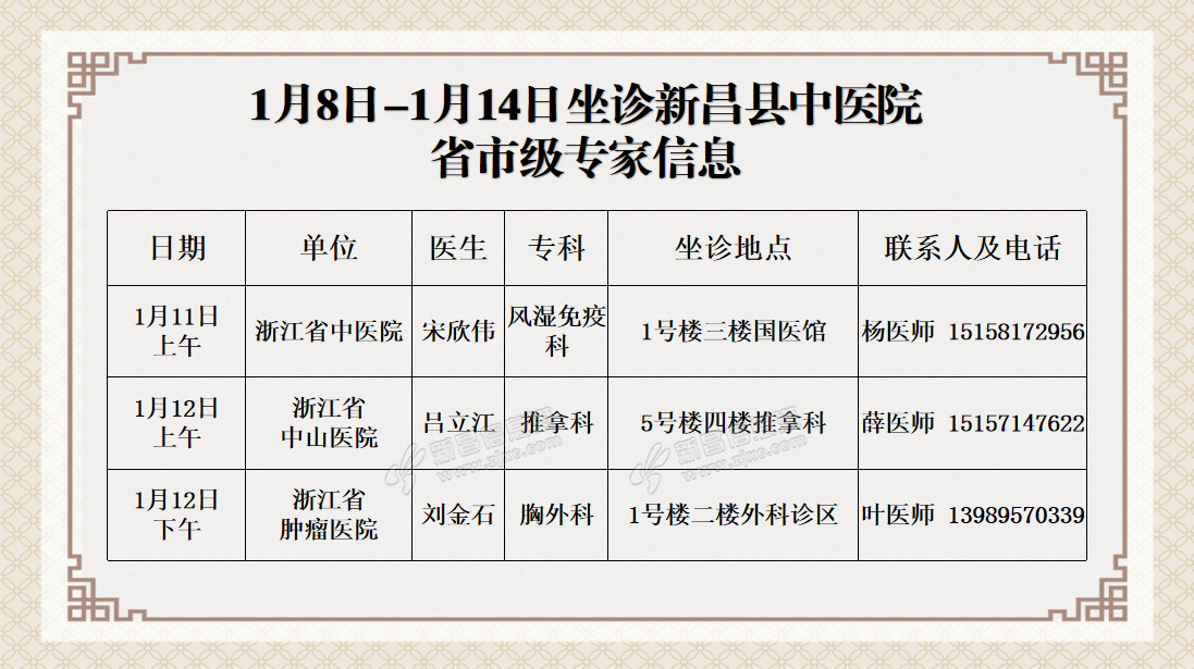 温 馨 提 示 新昌县中医院连贯医疗服务中心预约电话0575-86502366 门诊时间:上午08:00——11:30 下午13:30——17:00 急诊内、外科及发热门诊24小时开放。 来源:新昌县中医院