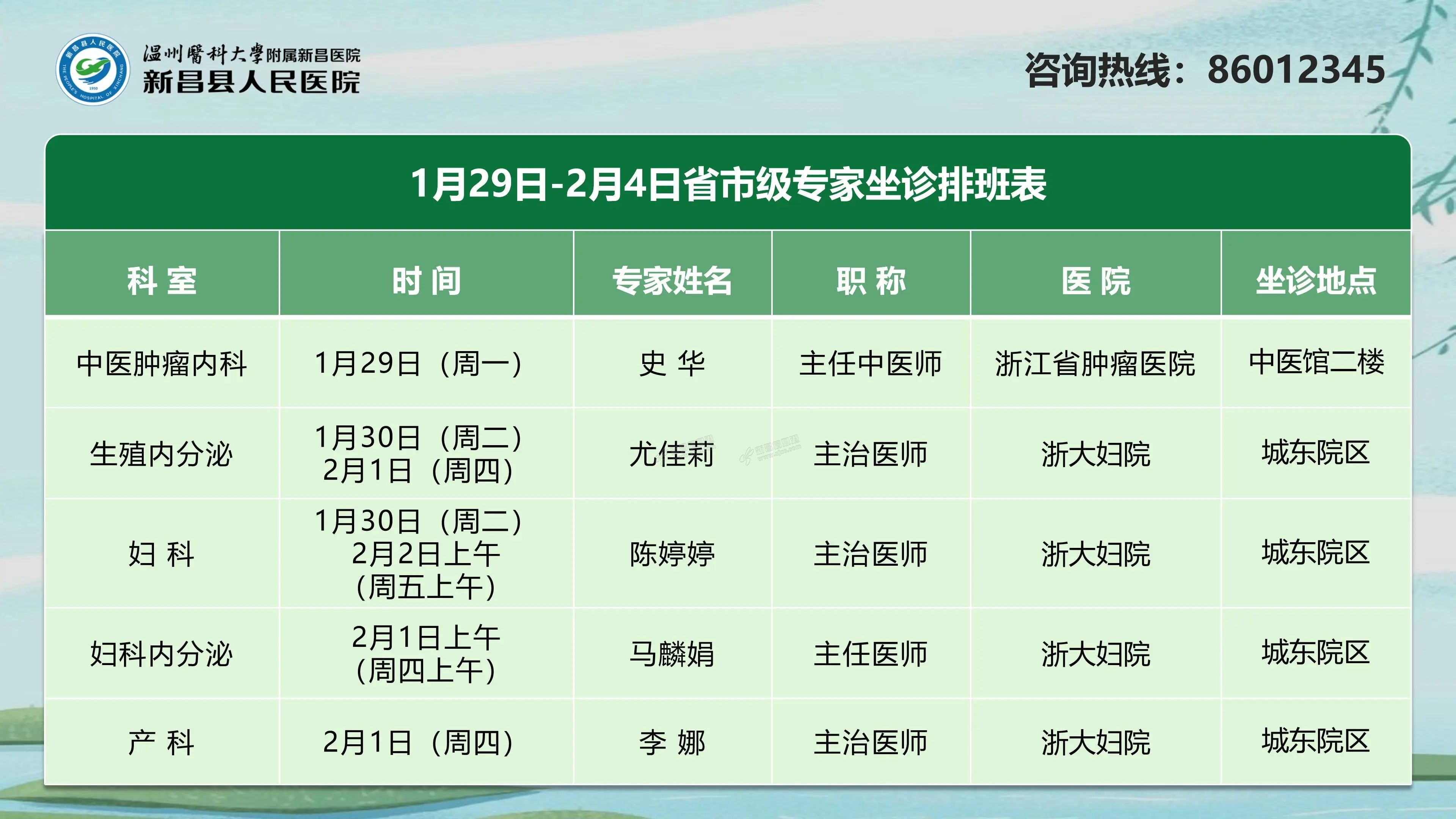 省市级专家坐诊信息 妇 科陈婷婷主治医师 预约挂号方式 电话预约:提前两天拨打0575-86012345 来源:新昌县人民医院