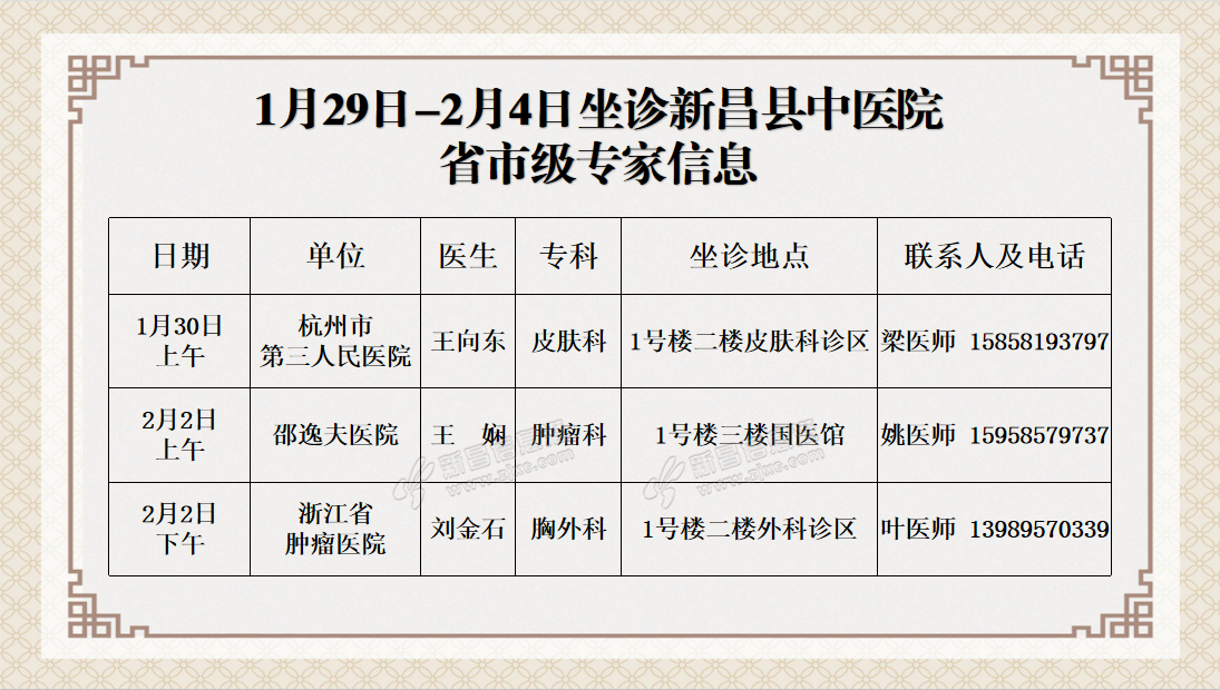 温 馨 提 示 新昌县中医院连贯医疗服务中心预约电话0575-86502366 门诊时间:上午08:00——11:30 下午13:30——17:00 急诊内、外科及发热门诊24小时开放。 来源:新昌县中医院 ...