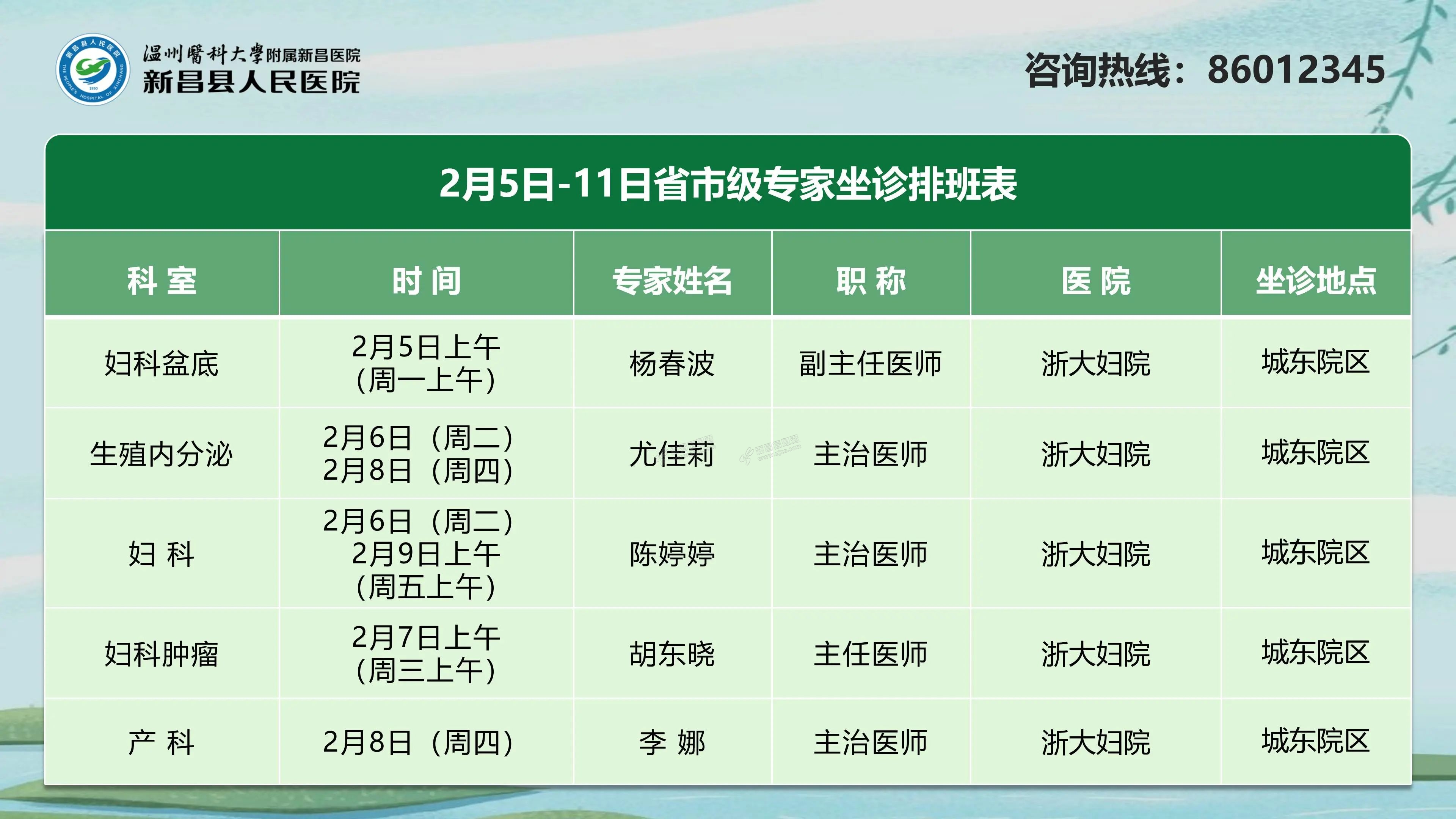 省市级专家坐诊信息 妇 科陈婷婷主治医师 预约挂号方式 电话预约:提前两天拨打0575-86012345 来源:新昌县人民医院