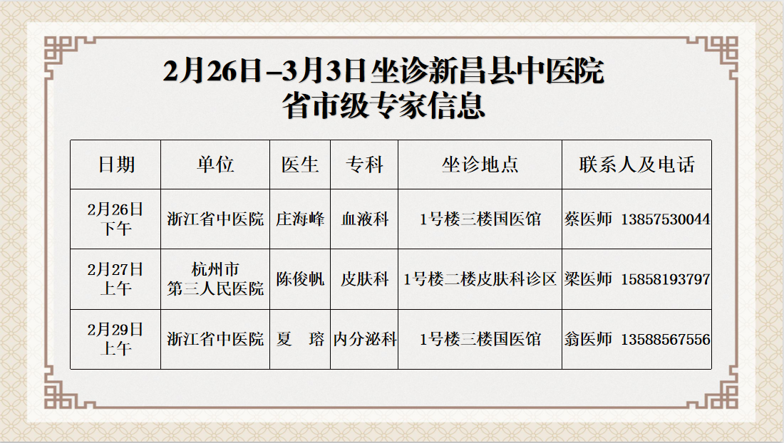 温 馨 提 示新昌县中医院连贯医疗服务中心预约电话0575-86502366 门诊时间:上午08:00——11:30下午13:30——17:00 急诊内、外科及发热门诊24小时开放。 来源:新昌县中医院