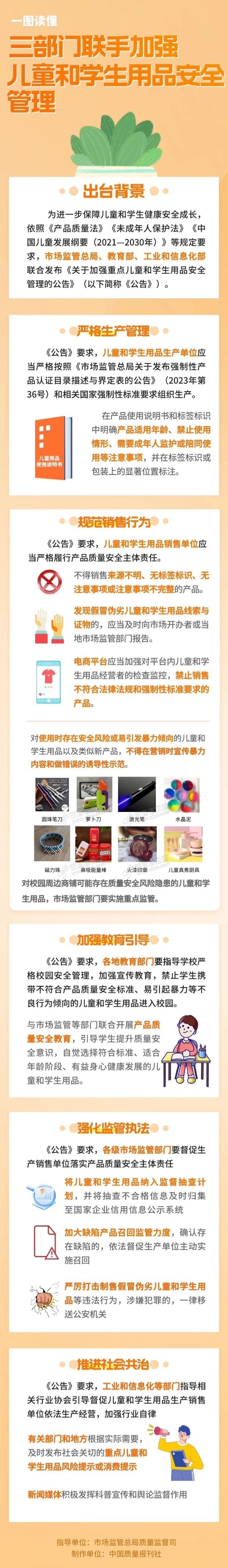 日前,市场监管总局、教育部、工业和信息化部联合发布《关于加强重点儿童和学生用品安全管理的公告》,《公告》的具体内容一起来看~ 为进一步保障儿童和学生健康安全成长,依照《产品质量法》《未成年人保护法》《 ...