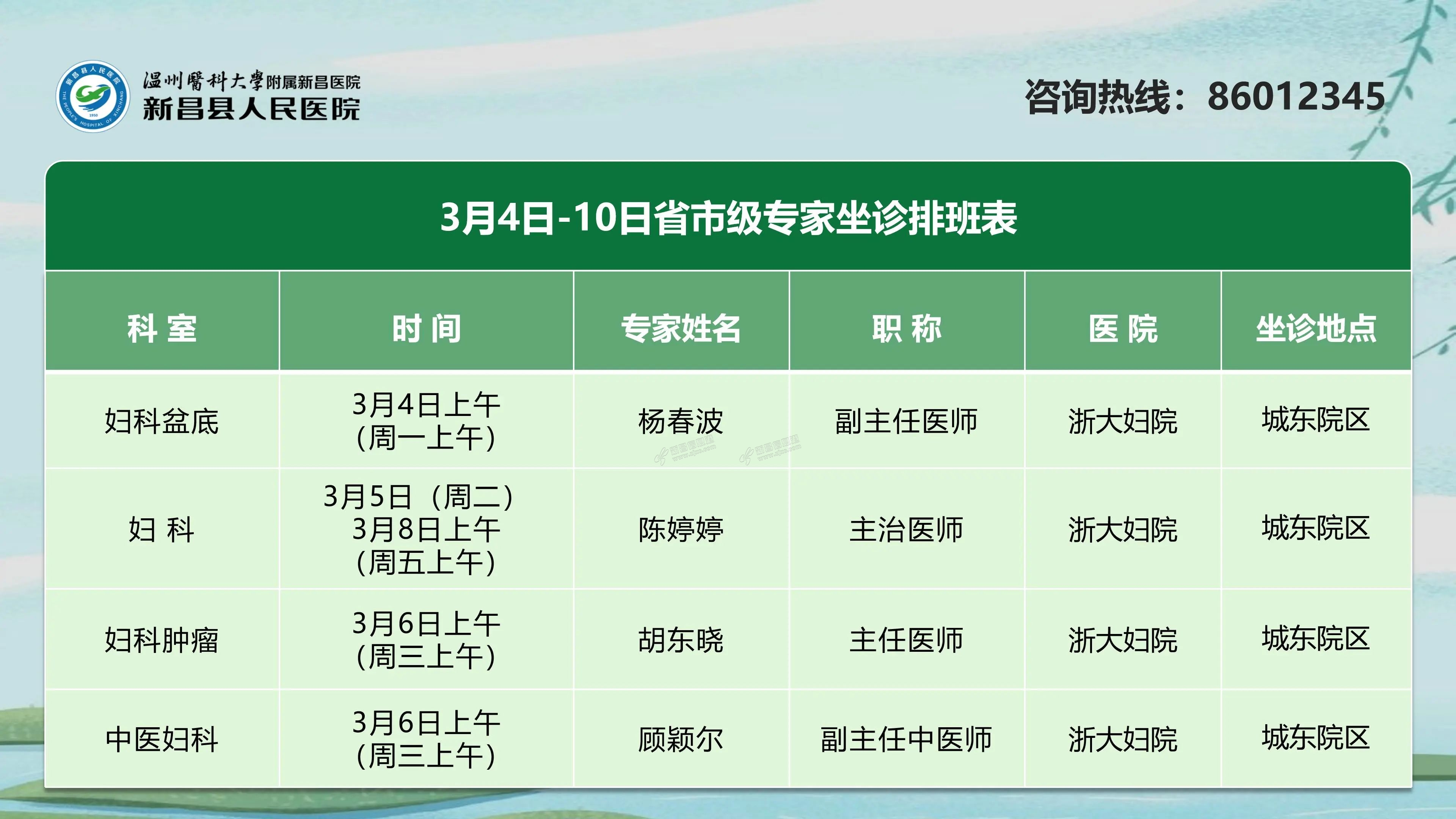 省市级专家坐诊信息 妇 科陈婷婷主治医师 预约挂号方式 电话预约:提前两天拨打0575-86012345 来源:新昌县人民医院