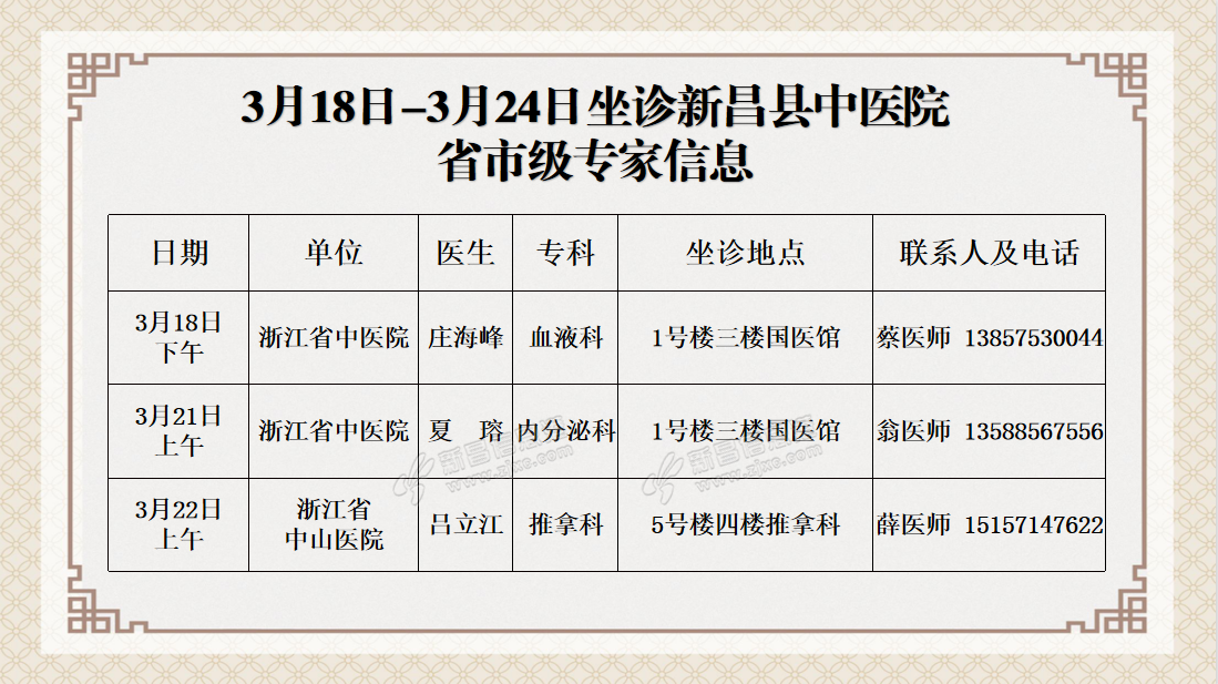 温 馨 提 示 新昌县中医院连贯医疗服务中心预约电话0575-86502366 门诊时间:上午08:00——11:30 下午13:30——17:00 急诊内、外科及发热门诊24小时开放。 来源:新昌县中医院