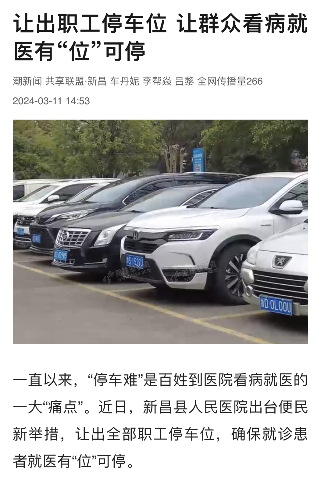 新昌县人民医院这一便民举措被多家媒体点赞! 新昌新闻 一直以来,“停车难”是百姓到医院看病就医的一大“痛点”。自3月5日县人民医院出台便民举措,让出全部职工停车位,切实确保了就诊患者就医时有“位”可 ...