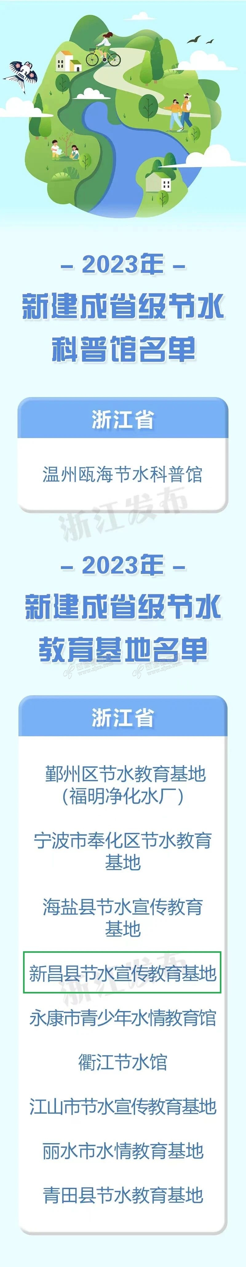 日前,全国节约用水办公室等主办的首届“节水中国行”主题宣传活动上,2023年省级节水科普馆及教育基地名单发布。其中,浙江有10家省级节水科普馆及教育基地上榜。新昌县节水宣传教育基地入选! 展示内容分 ...