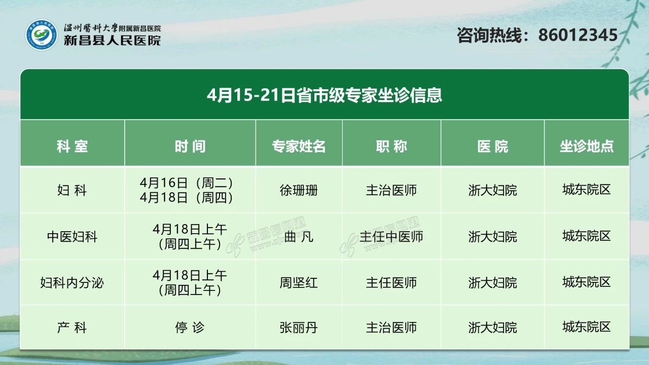 省市级专家坐诊信息 妇 科徐珊珊主治医师←点击图片查看详情 预约挂号方式 电话预约:提前两天拨打0575-86012345 来源:新昌县人民医院