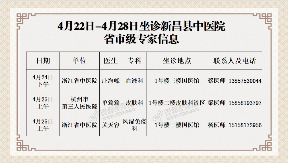 温 馨 提 示 新昌县中医院连贯医疗服务中心预约电话0575-86502366 门诊时间:上午08:00——11:30 下午13:30——17:00 急诊内、外科及发热门诊24小时开放。 来源:新昌县中医院
