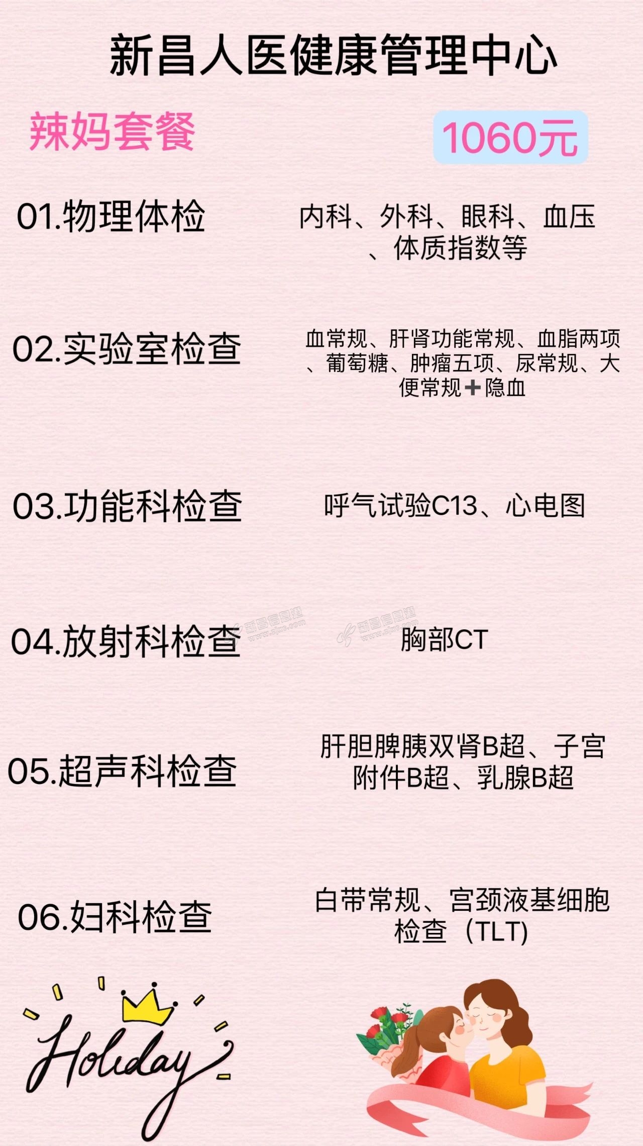 5月12日就是母亲节了,为感恩母亲,即日起,新昌县人民医院健康管理中心特推出“母亲节精选体检套餐”。 NO.01 辣妈套餐 以上套餐均赠送营养早餐一份。上述两个体检套餐已在新昌人医健康管理中心上线, ...