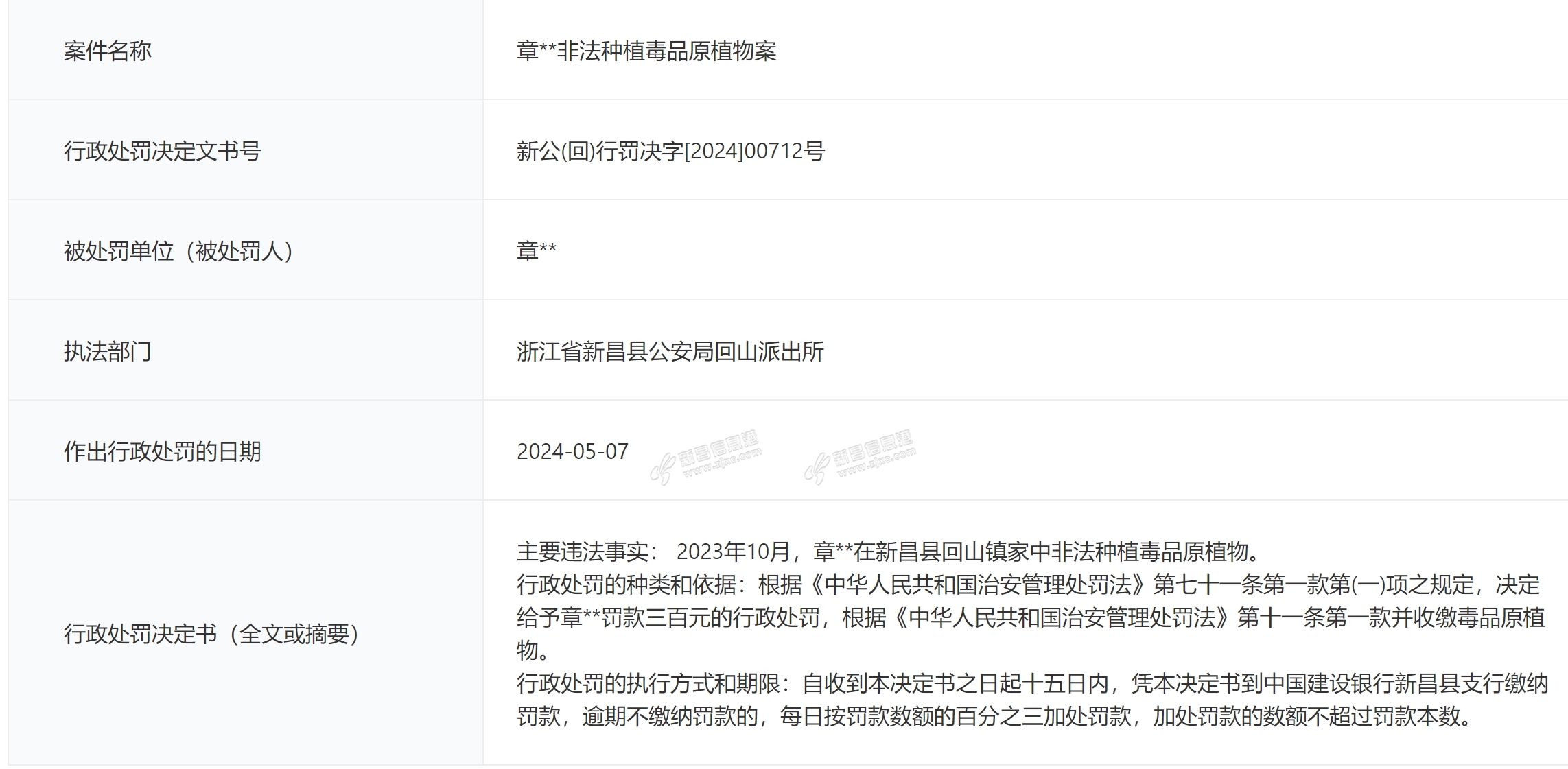 主要违法事实:2024年4月8日早上,胡**在新昌县一厂区门口殴打他人。行政处罚的种类和依据:根据《中华人民共和国治安管理处罚法》第四十三条第一款之规定,决定给予胡*行政拘留七日并处罚款三百元的行政处罚 ...
