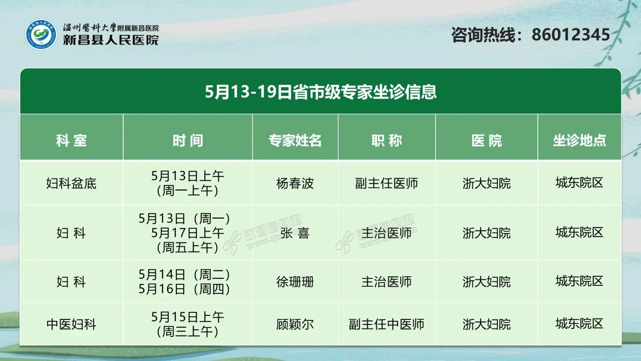 省市级专家坐诊信息 产 科张丽丹主治医师←点击图片查看详情 预约挂号方式 电话预约:提前两天拨打0575-86012345 来源:新昌县人民医院