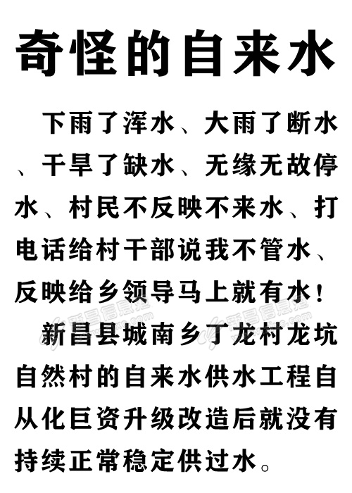 | 城南乡丁龙村又没水啦!江南雨季还有村没饮用水, |
