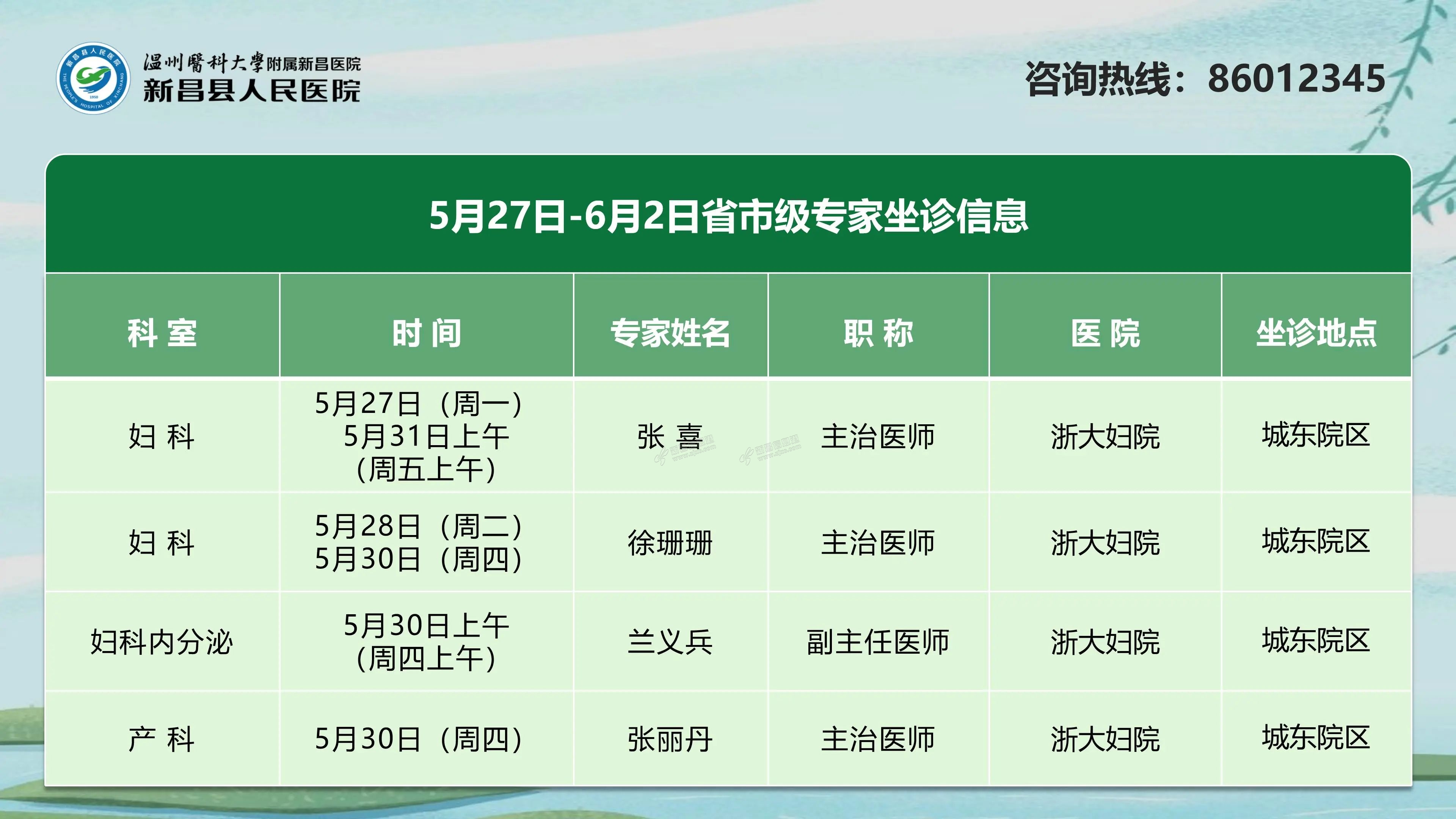 省市级专家坐诊信息 产 科张丽丹主治医师←点击图片查看详情 预约挂号方式电话预约:提前两天拨打0575-86012345 来源:新昌县人民医院