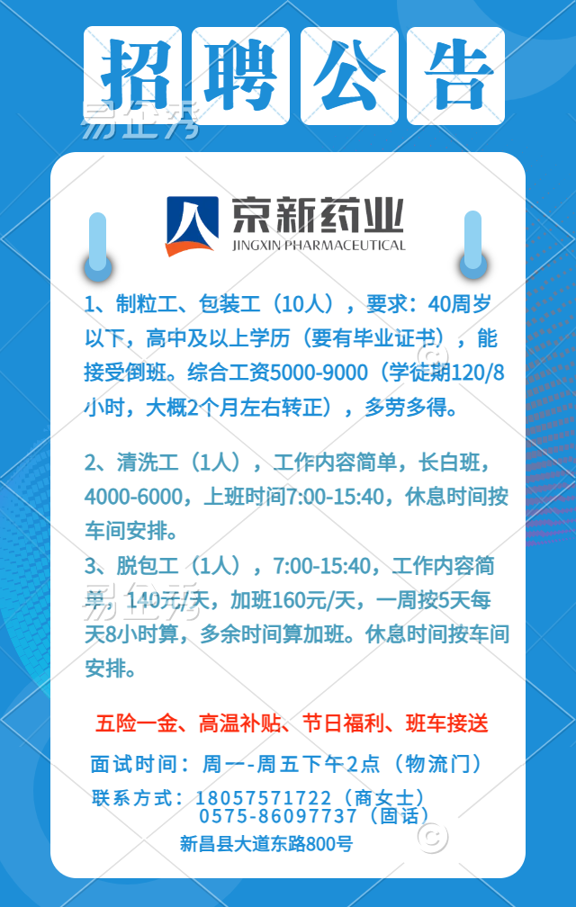 京新药业急招垃圾清运小工,65周岁及以下,长白班,每天工作8小时,工资140元+超产工资,缴纳工伤险,请各位帮忙推荐,感谢感谢!!