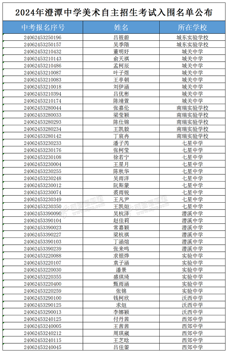 2024年澄潭中学美术自主招生考试入围名单公布2024年澄潭中学自主招生美术成绩已经揭晓,现将入围名单(65分及以上)公布如下: 来源:新昌澄潭中学