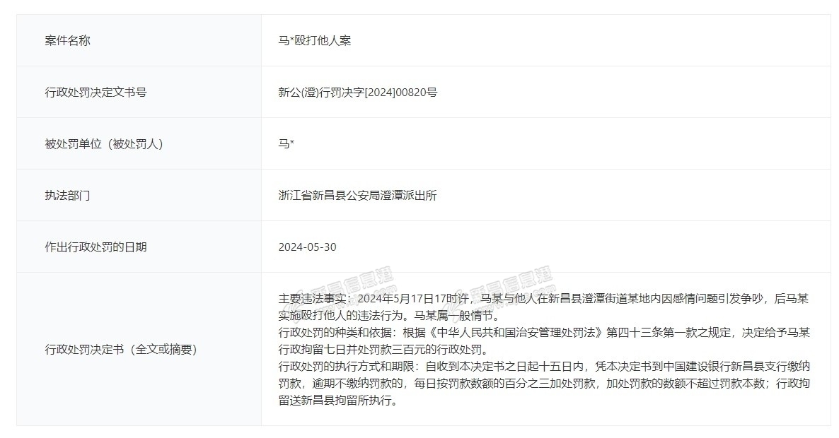 主要违法事实:2024年5月17日17时许,马某与他人在新昌县澄潭街道某地内因感情问题引发争吵,后马某 实施殴打他人的违法行为。马某属一般情节。 行政处罚的种类和依据:根据《中华人民共和国治安管理处罚法》 ...